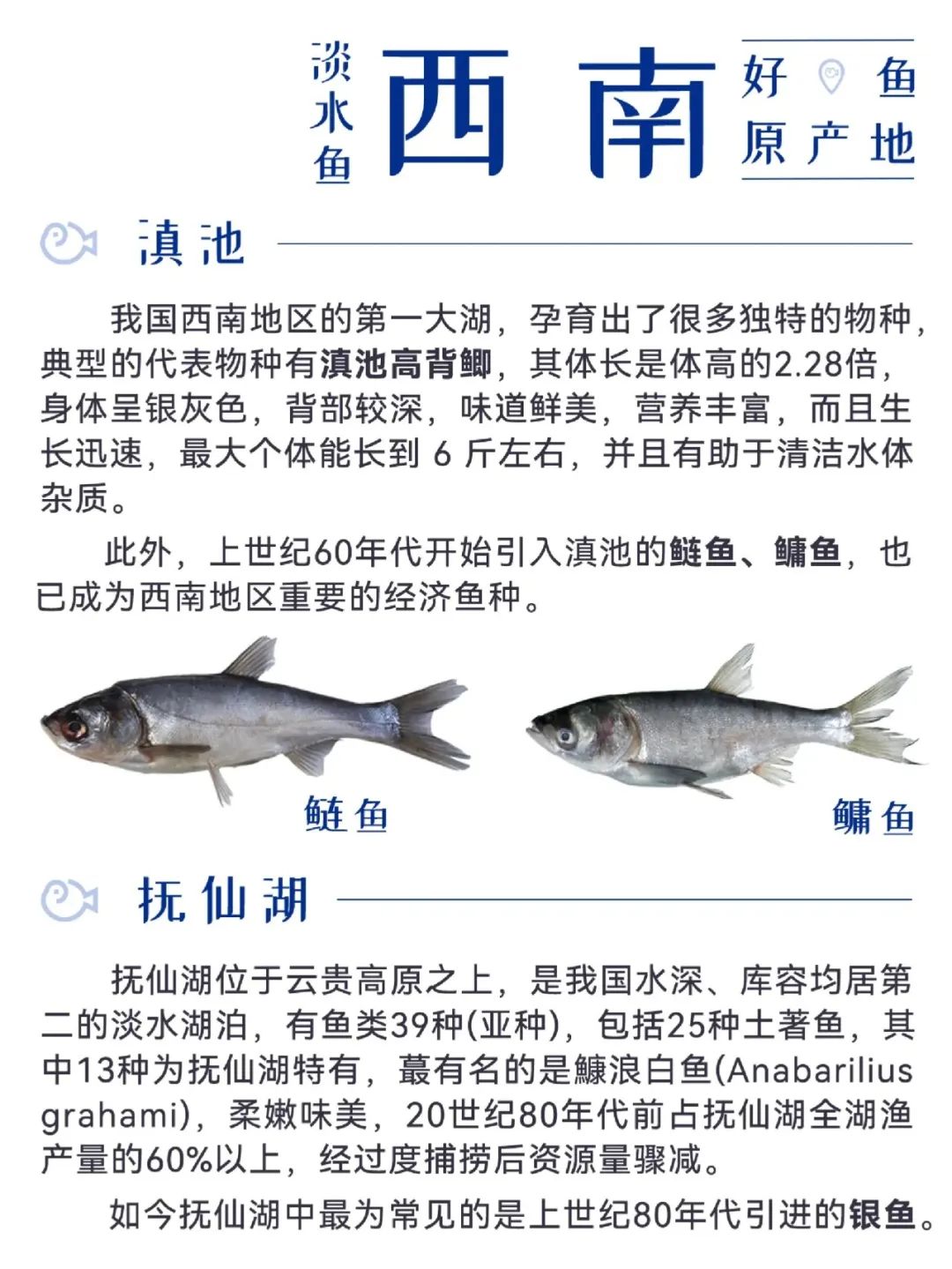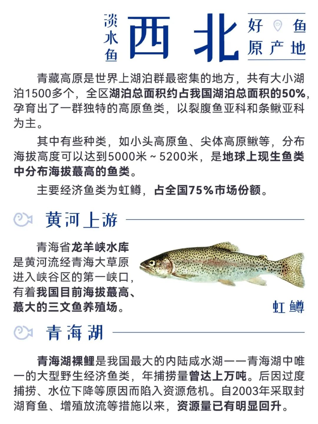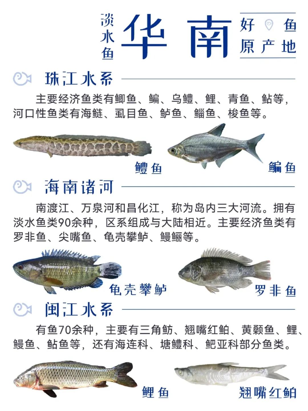 淡水鱼类遍布我国大江南北,从寒冷的东北三省,到温暖潮湿的东南部沿海地区,再到内陆的西北、西南等地,各处都有特色经济鱼种。
