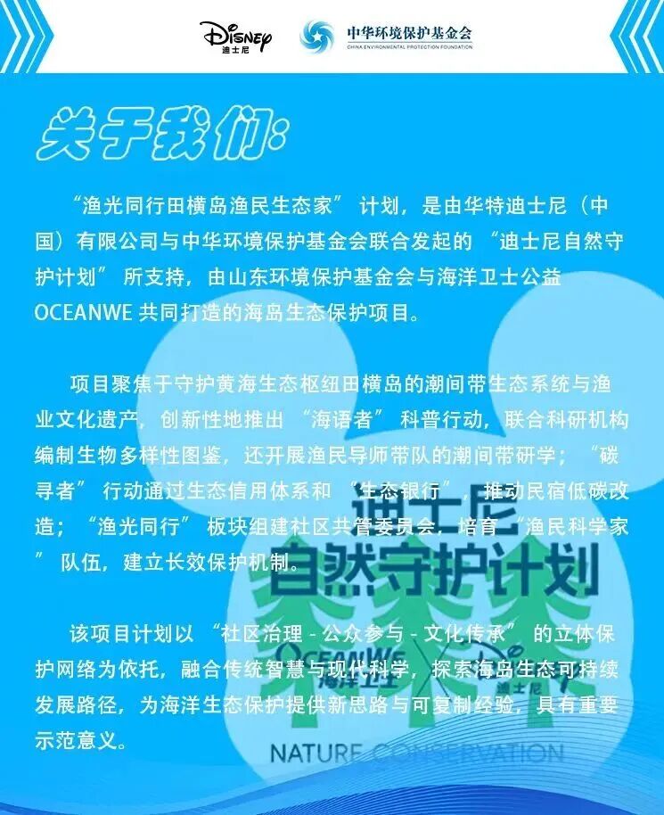该项目由山东环境保护基金会、海洋卫士公益OCEANWE联合打造,并获华特迪士尼(中国)有限公司与中华环境保护基金会发起的“迪士尼自然守护计划”支持,旨在通过专业培训,强化海岛居民生态保护能力,推动田横岛生态可持续发展。