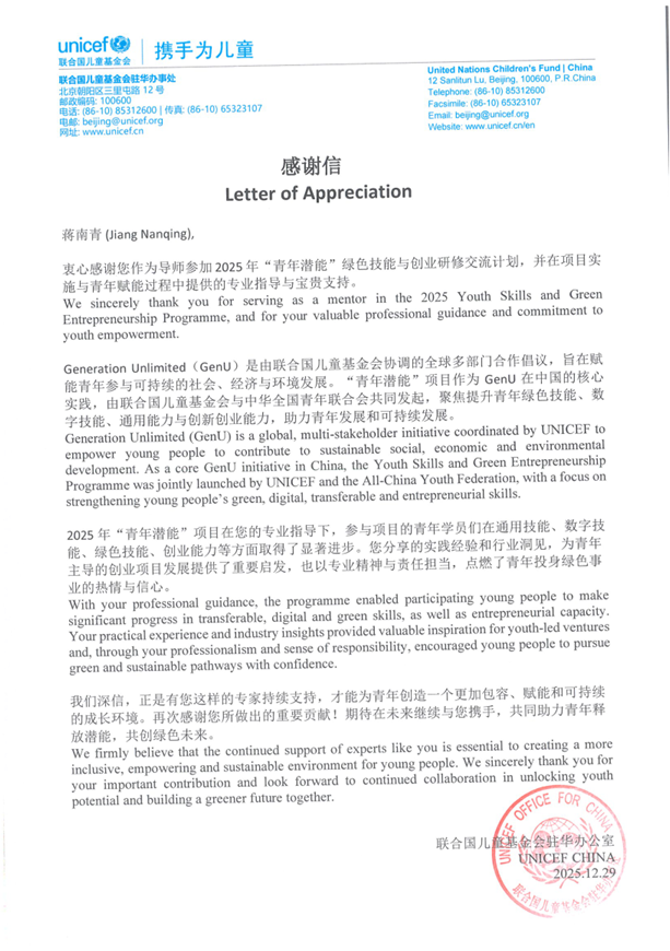 近日,联合国儿童基金会(UNICEF)驻华办事处致函海洋卫士理事蒋南青博士,对其在2025年“青年潜能”绿色技能与创业研修交流计划中担任导师所作出的专业贡献与鼎力支持表示诚挚感谢。